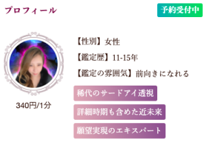 | 鑑定のタイプ | 結果の伝え方:ストレート 雰囲気:ユーモア 話し方:おっとり |