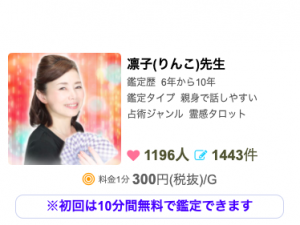ここまで読んで他の占い師と比べてみたい人や、つかさ先生の鑑定が合わなかった人にオススメの占い師は凛子先生です。